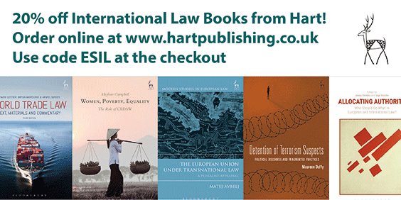 There are three ESIL Lectures scheduled for the busy month of April: Attila Tanzi, ‘The Prevention and Settlement of Hydroelectric Industry Related Disputes under International Law: A Multi-Layered Approach’ (5 April); Veronika Fikfak, ‘Monetising Human Rights’ (13 April); Ekaterina Trendafilova: ‘The Kosovo Specialist Chambers as a New Model of Transitional Justice in the Balkan Region’ (24 April). They follow the recent ESIL Lecture by Lorenzo Gradoni on the ‘Position and Agency of the WTO Dispute Settlement System in the Fragmented World of International Adjudication’ already available on our website. We would like to encourage all members to make proposals for ESIL Lectures to Philippa Webb and Fulvio Palombino following the procedure established on our website.