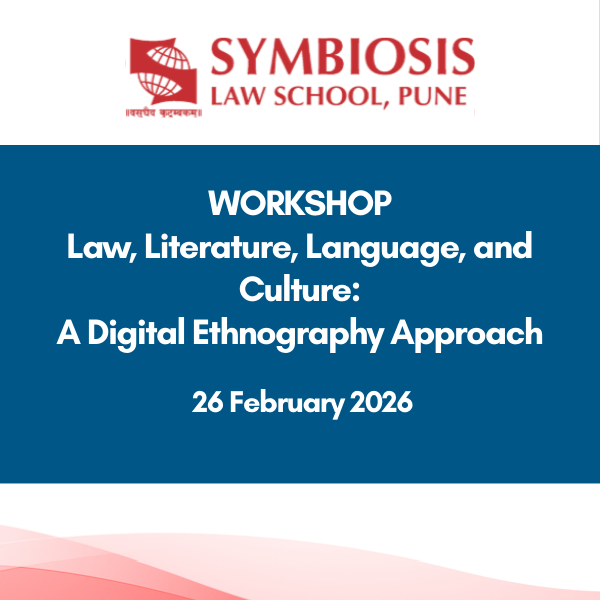 The Symbiosis Law School, Pune is organising a workshop titled “Law, Literature, Language, and Culture: A Digital Ethnography Approach” on 26 February 2026 through Symbiosis Centre for Advanced Legal Studies and Research (SCALSAR) and Symbiosis Culture, Language, Law & Justice Centre (SCLLJC). The initiative seeks to advance interdisciplinary scholarship by foregrounding the cultural, linguistic, and narrative dimensions of law.